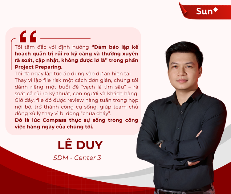 Ngay sau khi tiếp xúc với 25 chuẩn hành vi tại Leader’s Compass, anh Duy đã áp dụng ngay nguyên tắc “Đảm bảo lập kế hoạch quản trị rủi ro kỹ càng và thường xuyên rà soát, cập nhật, không được lơ là” trong phần Project Preparing ở một dự án mới của Center 3. Thay vì lập file risk 1 cách đơn giản, anh dành riêng một buổi để cùng Project leader và key member “vạch lá tìm sâu” – rà soát cả rủi ro kỹ thuật, con người và phía khách hàng. Với mỗi rủi ro, team đều xác định rõ trigger (dấu hiệu nhận biết) và action plan (kế hoạch hành động). Giờ đây, file đó được review hàng tuần trong họp nội bộ, trở thành công cụ sống, giúp team chủ động xử lý thay vì bị động “chữa cháy”. “Đó là lúc Compass thực sự sống trong công việc hàng ngày của chúng tôi,” anh Duy chia sẻ.