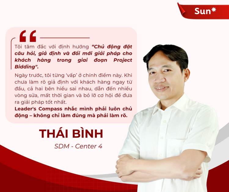 Trong 25 chuẩn hành vi của Compass, anh Bình tâm đắc nhất với nhóm hành vi liên quan đến việc chủ động đặt câu hỏi, giả định và đổi mới giải pháp cho khách hàng trong giai đoạn Project Bidding. “Ngày trước, tôi từng ‘vấp’ ở chính điểm này,” anh kể. “Khi chưa làm rõ giả định với khách hàng ngay từ đầu, cả hai bên hiểu sai nhau, dẫn đến nhiều vòng sửa, mất thời gian và bỏ lỡ cơ hội để đưa ra giải pháp tốt nhất. Compass nhắc mình phải luôn chủ động – không chỉ làm đúng mà phải làm rõ.”