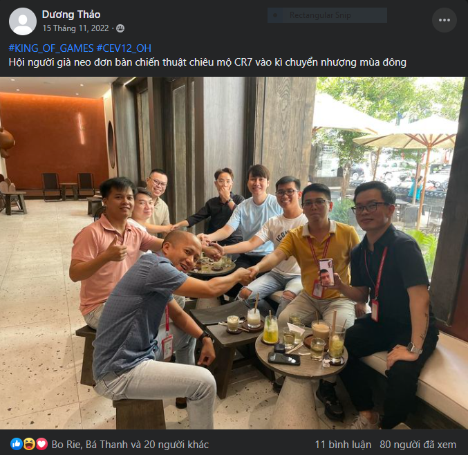 Thời điểm cuối năm 2022, số lượng anh chị em CEV12 remote khá nhiều. Chính vì vậy, để gắn kết các thành viên, đồng thời “dụ dỗ” anh chị em lên văn phòng nhiều hơn thì Ban Văn Hóa (BVH) đã phát hành chuỗi game mang tên King of Game. Đây là chuỗi ”liên hoàn” game được tổ chức trong 1 thời gian dài, từ khi kickoff chia team (9/11) đến khi game cuối cùng trong đêm YEP của CEV12 (6/1).