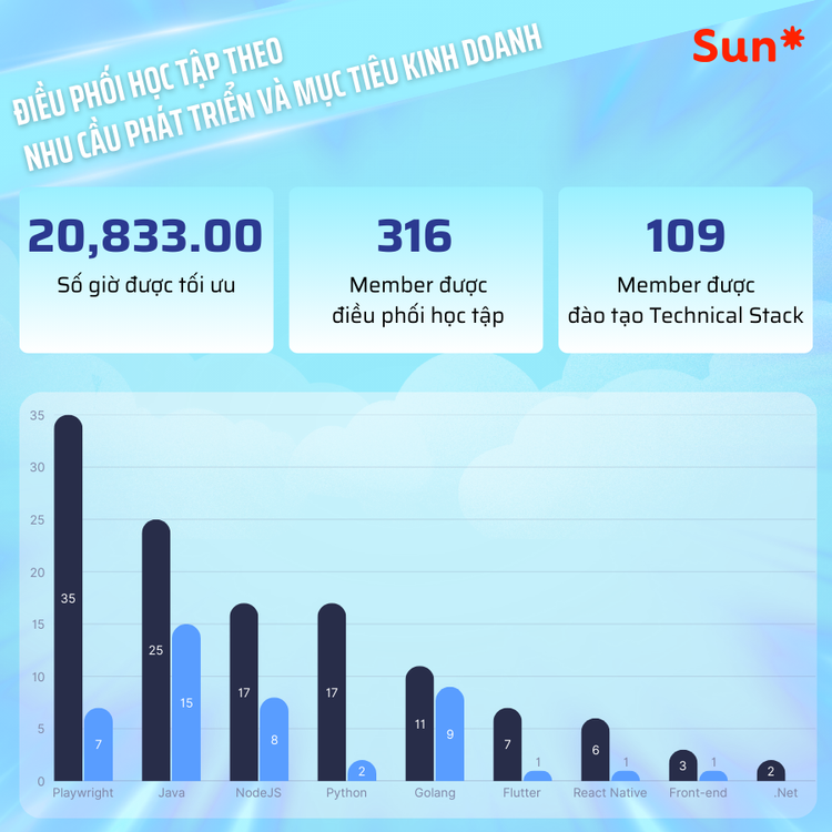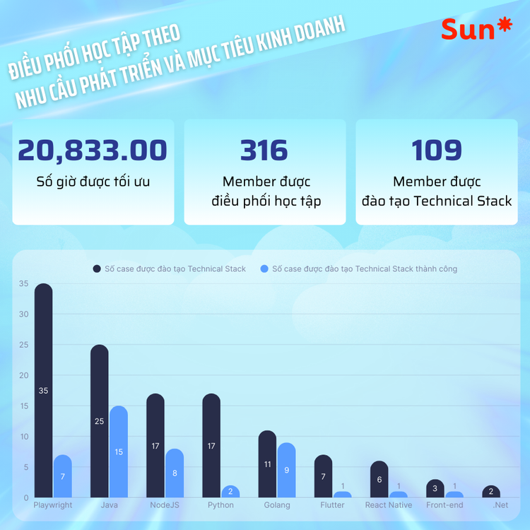 Hơn 20,833 giờ được tối ưu từ effort trống charge. 316 member được điều phối vào các chương trình học tập có mục tiêu. Và 109 member đã được đào tạo Technical Stack mới – như Python, React Native hay NodeJS – rồi đưa thẳng vào dự án.