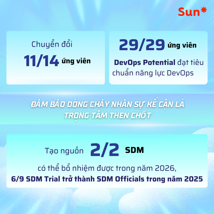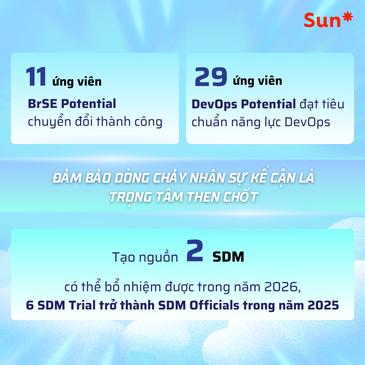 Trong năm 2025, các chương trình BrSE Potential, DevOps Potential và SDM Development được triển khai nhằm tạo nguồn và nâng cao mức độ sẵn sàng cho các vị trí nòng cốt. 29 Developers đã mở rộng năng lực DevOps, 11 ứng viên BrSE hoàn thành lộ trình chuyển đổi – những kết quả bước đầu cho thấy tổ chức đang hình thành một lớp nhân sự có nền tảng và trải nghiệm tốt hơn cho giai đoạn tiếp theo.