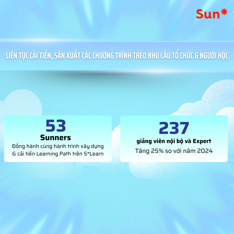 Lời kếtNăm 2025 đánh dấu một bước trưởng thành rõ nét của văn hóa học tập toàn Sun*. Những nền tảng đã được thiết lập trong năm qua đang từng bước hướng tới mục tiêu hình thành thói quen học tập liên tục một cách chủ động, mở ra kỳ vọng về một giai đoạn mới – nơi việc học trở nên “tự nhiên như hơi thở” trong đời sống công việc hằng ngày. Với định hướng chiến lược AI Driven Development, các hoạt động học tập sẽ đóng vai trò then chốt trong việc giúp Sunner làm chủ công nghệ, từng bước đưa Sun* trở thành một tổ chức AI-ready. Và đây sẽ chính là ngọn đuốc dẫn đường, để mỗi người Sun* vững tin làm chủ sự thay đổi, sẵn sàng đón đầu bất cứ thách thức nào trong kỷ nguyên mới. |