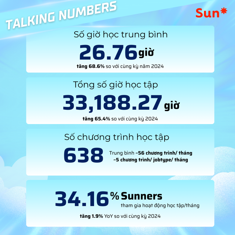 Năm 2025, giờ học trung bình của Sun* tăng gần 50% so với năm trước, với 35% Sunners tham gia học tập mỗi tháng – cao hơn benchmark ngành. Đáng chú ý hơn, đà tăng này diễn ra mạnh mẽ hơn vào nửa sau của năm, cho thấy đây không phải một phong trào ngắn hạn, mà là một xu hướng học tập bền vững.